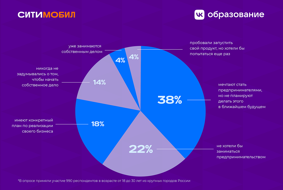 Согласно результатам опроса, 56% опрошенных молодых людей хотели бы в перспективе стать предпринимателями и запустить свой стартап. При этом 38% из них говорят о будущем собственном деле как о далёкой мечте, а 18% имеют конкретный план по реализации собственного бизнеса. 4% респондентов же уже работают на себя. Ещё 4% признались, что пробовали однажды запустить собственный продукт, но им хочется попробовать свои силы ещё раз. 22% опрошенных ответили, что не хотели бы заниматься предпринимательством. 14% никогда не задумывались о том, чтобы начать собственное дело.