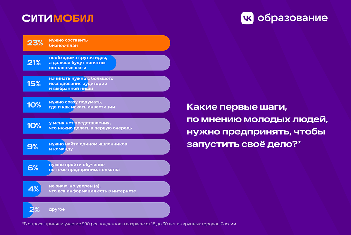 Сервис “Ситимобил для бизнеса” и VK Образование (входят в экосистему VK) совместно с аналитической компанией ResearchMe провели опрос*, чтобы выяснить, сколько молодых людей хотели бы стать предпринимателями, какие сферы они видят привлекательными для запуска стартапа и кто из них уже проходит обучение для этого.
