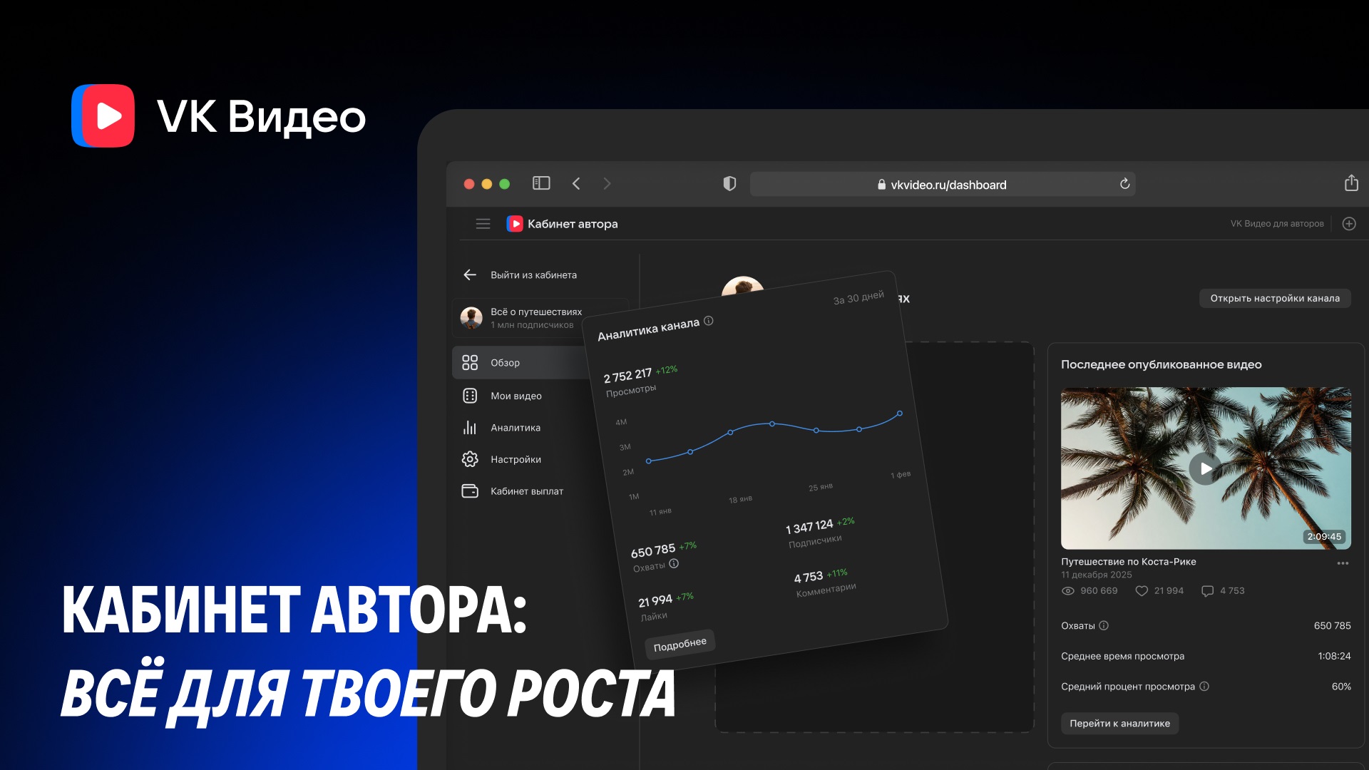Платформа представила обновлённый кабинет автора — удобный инструмент для работы с контентом и анализа аудитории. Управление каналом стало ещё проще, а аналитика — глубже и нагляднее.