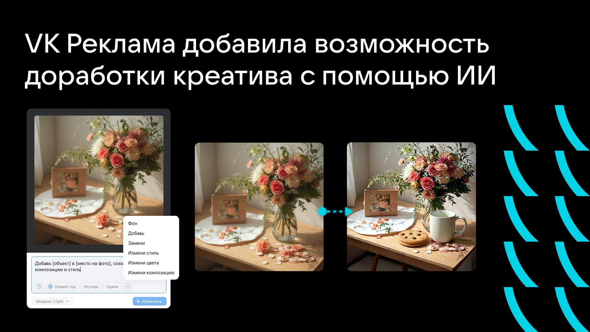 Рекламодатели могут самостоятельно добавлять или удалять объекты, менять фон и вносить другие визуальные изменения в креатив с помощью простых текстовых команд в рекламном кабинете.
