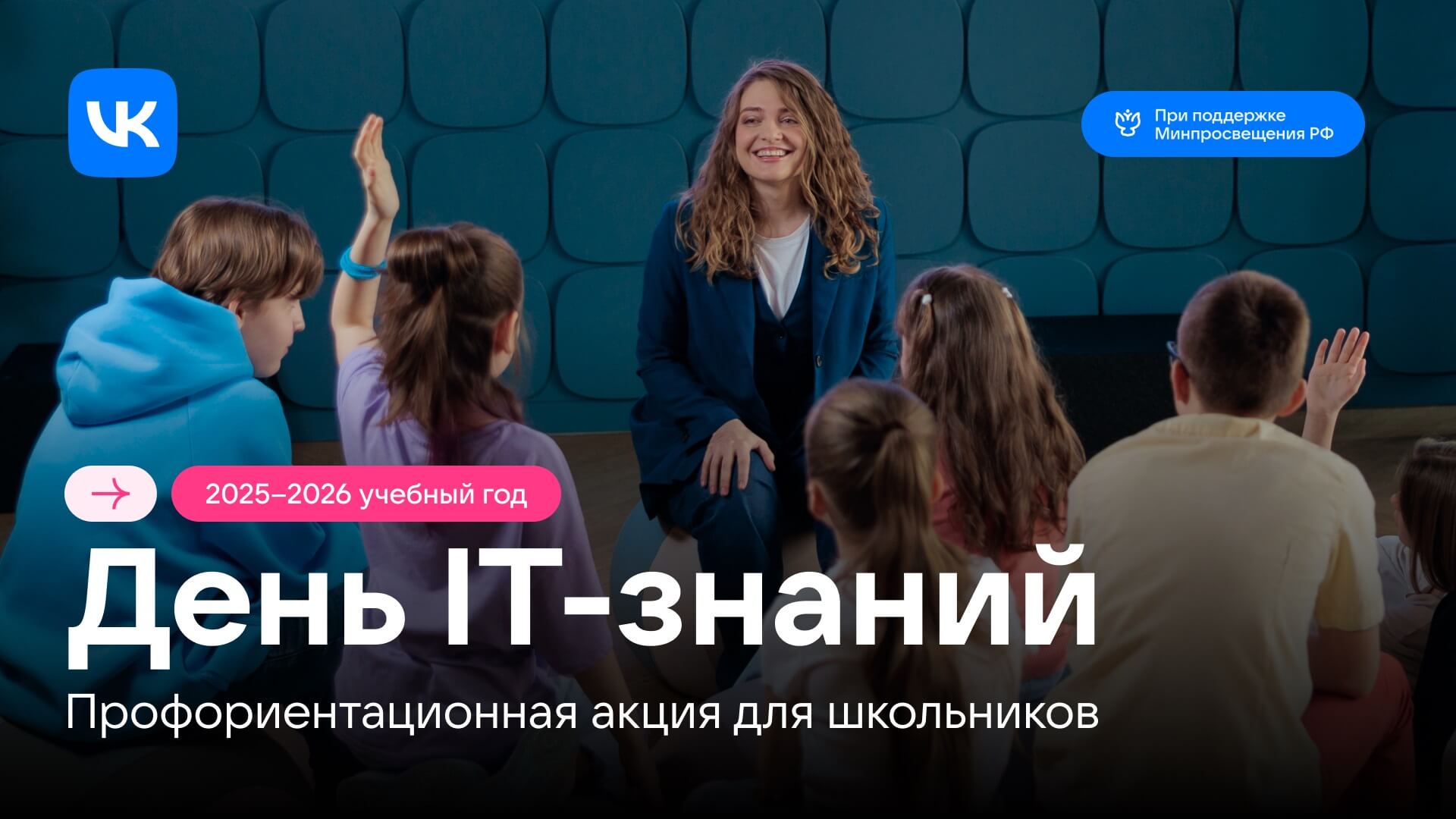 «День IT-знаний» – это ежегодная профориентационная акция VK, ориентированная на учеников 7–11-х классов и посвященная востребованным цифровым профессиям, планированию профессионального будущего и построению карьеры в IT. Проект проводится с 2017 года при поддержке Минпросвещения России.