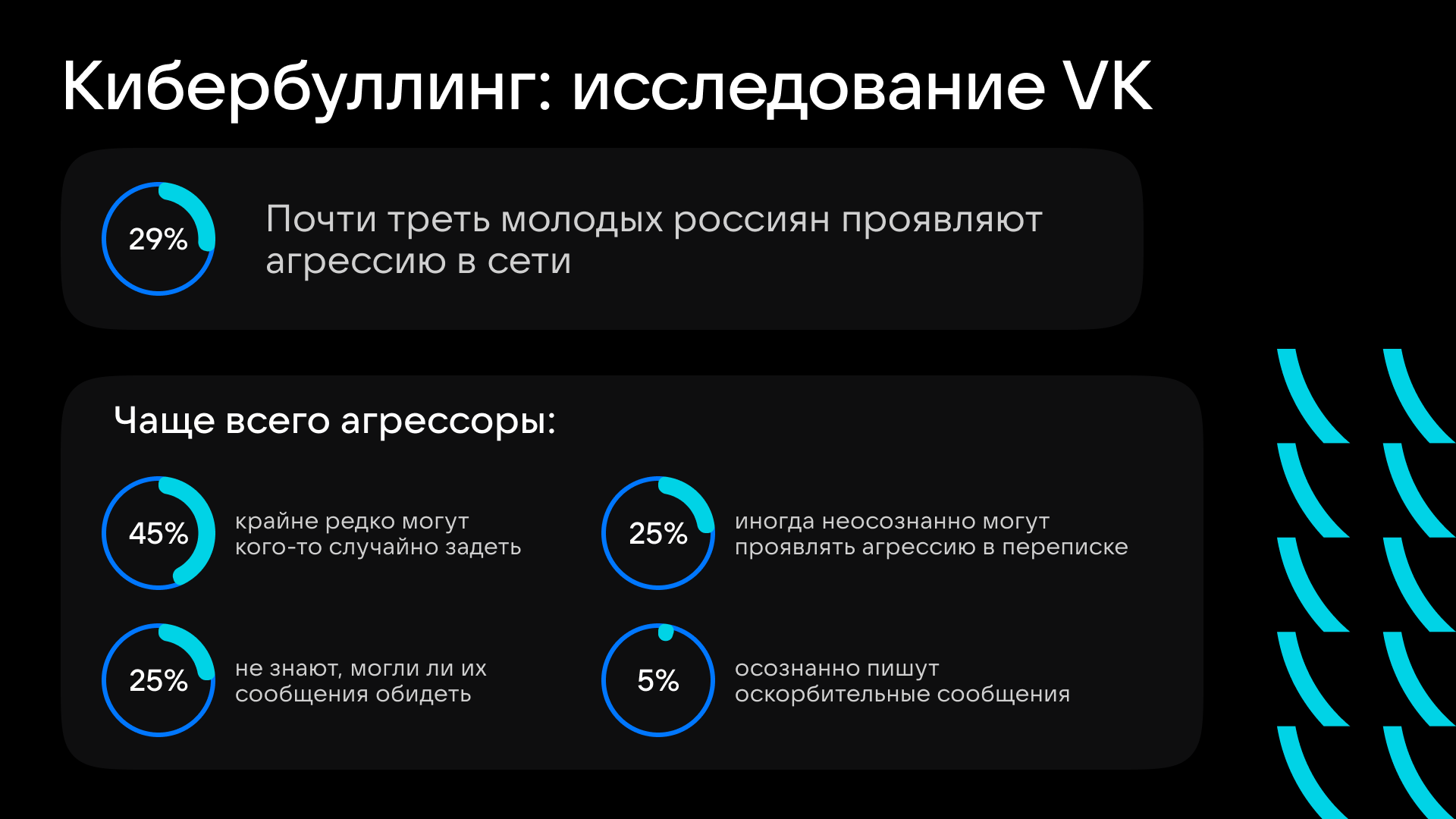 Согласно результатам опроса, почти треть молодых россиян в возрасте от 14 до 22 лет выступала в роли агрессора (29%)*. Только 5% агрессоров отметили, что пишут оскорбления осознанно с целью обидеть, остальные 95% рассказали, что делают это без злого умысла, а иногда даже не осознают, что могли кого-то задеть.